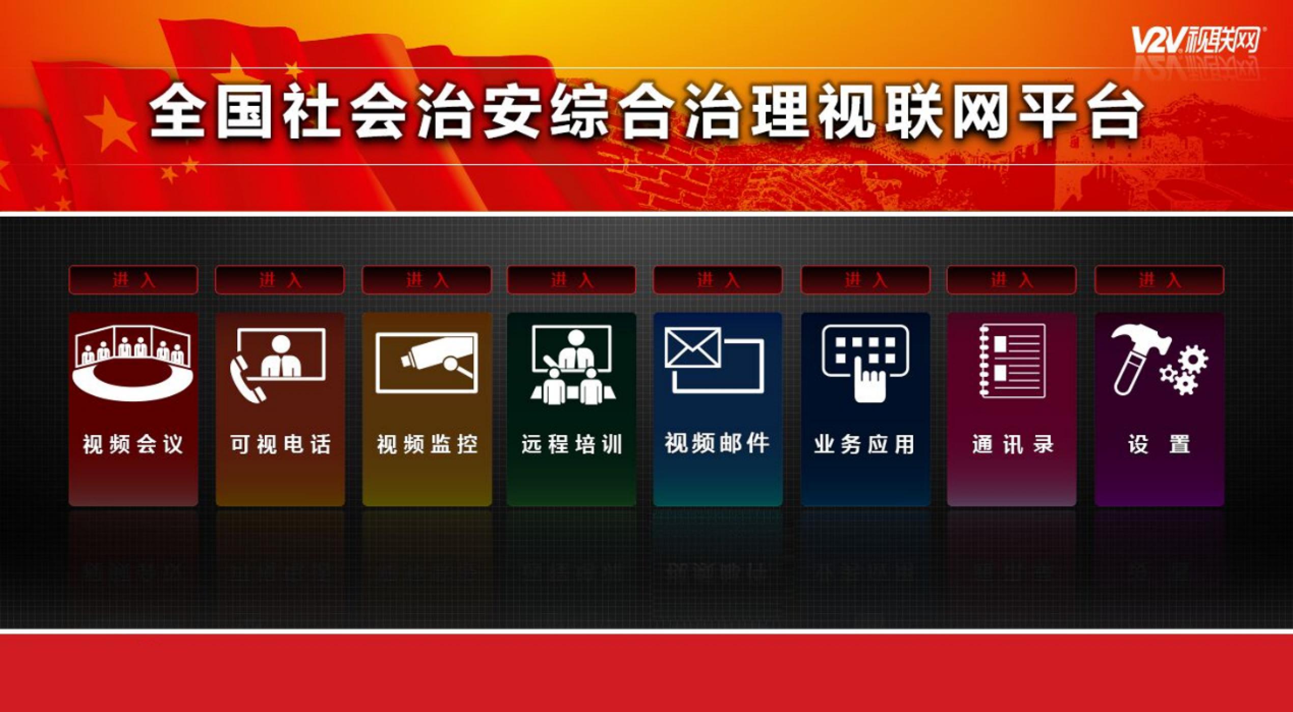 綜治視聯網是運用“V2V視聯網”、“統一視頻”、“視頻云計算”等多項技術,采用多項專利技術,針對全新建設思路提出的全新的視頻通訊平臺。覆蓋全國的視頻會議的基本功能實現;全高清、全兼容的視頻通訊系統;可以與現有的監控、會議系統實現互聯互通;與國家、其他省市視聯網平臺互聯互通;實現一個平臺下實現多功能的特性,節省開支;實現可成長、可擴充的應用模式,支持“橫到邊、縱到底”的擴容模式。
