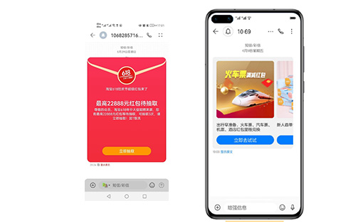 智能消息是通過(guò)手機(jī)終端信息增強(qiáng)技術(shù),將傳統(tǒng)文本短信無(wú)縫升級(jí)為可交互的富媒體信息,目前智能消息可以適配的手機(jī)品牌主要有華為、小米、oppo、vivo等,支持智能消息的機(jī)型直接顯示為智能消息(右圖),不支持智能消息的機(jī)型直接顯示為文本短信(左圖)